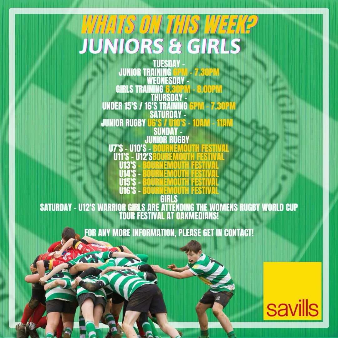 Saturday features the 1XV taking on Oakmedians and our U12 Warrior Girls heading to the World Cup Tour Festival, while Sunday belongs to the next generation with a stacked Bournemouth Festival for the U7s-U16s and a crucial development clash for the Colts against Wimborne. It’s a packed schedule from the first whistle to the final try, so get your kit ready and let’s get to work!